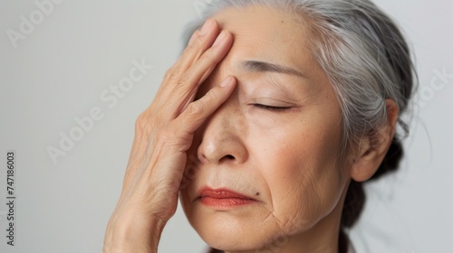 An elderly woman with closed eyes resting her hand on her forehead conveying a sense of concern or contemplation.