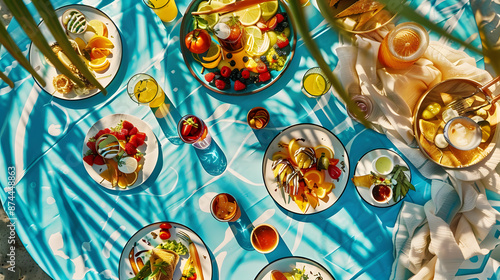 An electric blue picnic table adorned with plates of food and drinks, creating a visual art piece resembling a painted pattern drawing under a glass ceiling at a circle event