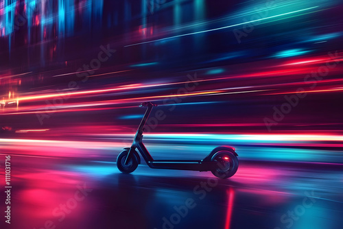 An electric scooter stands still as colorful lights streak by in a bustling urban landscape