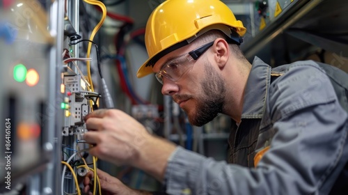 An electric technician examining electrical components, portrayed in a dynamic angle raw photo that underscores expertise and dedication to craftsmanship