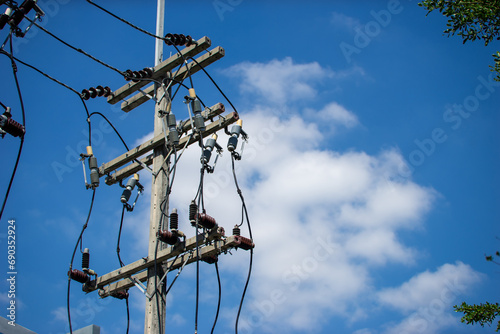 An electrical pole that shows the disorder in the arrangement of the cables.