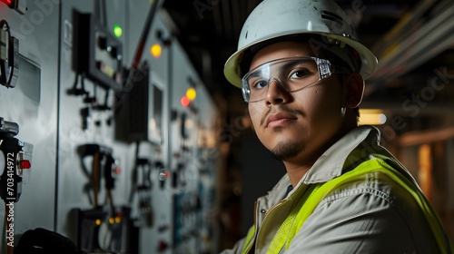 An electrician in a hard hat and reflective vest confidently operates a complex electrical panel.