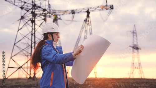 An electrician on the background of high towers of power plants looks at the project for the development of an electrical structure, the expansion of the electrical voltage of volts in the wires.
