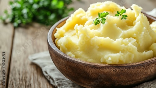 An elegant and high resolution image of creamy homemade mashed potatoes in a rustic bowl on a clean wooden table background