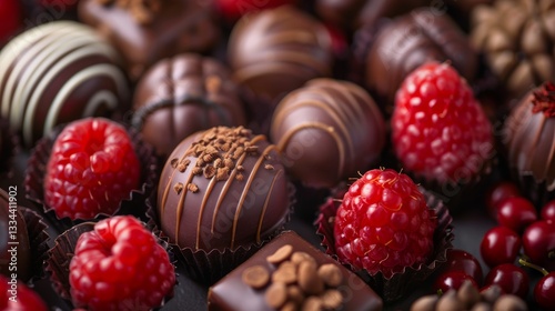 An Elegant Arrangement of Gourmet Dark Chocolate Pralines with Fresh Raspberries, Showcasing Variety of Shapes and Decorative Toppings on a Dark Surface