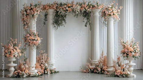 An elegant backdrop of white columns accented with soft pink blossoms, perfect for weddings or photo opportunities