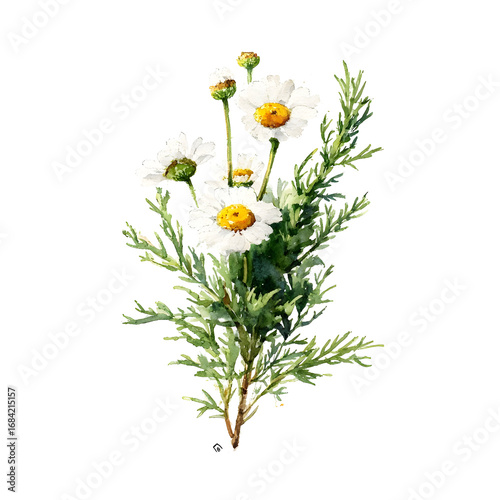 An elegant botanical watercolor illustration of a delicate chamomile sprig, showcasing a classical and detailed artistic style isolated on a white background