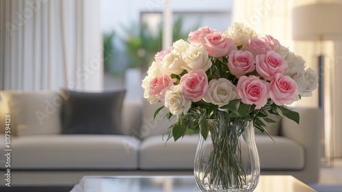 An elegant bouquet of pink and white roses in a clear vase, placed in a cozy living space to create a serene,