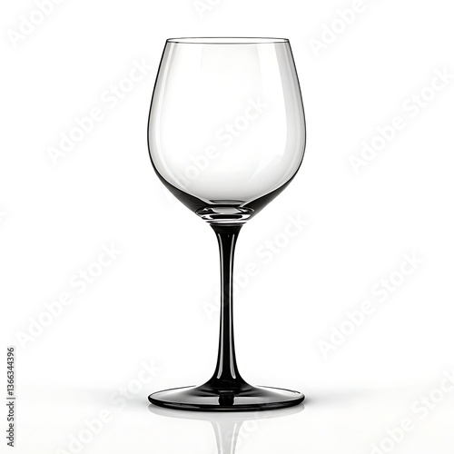 An elegant, clear wine glass with a sleek black stem, poised for a sophisticated evening, reflecting light on a pristine white background.