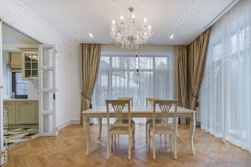 An elegant dining area with a chandelier and large windows providing natural light in a modern house.