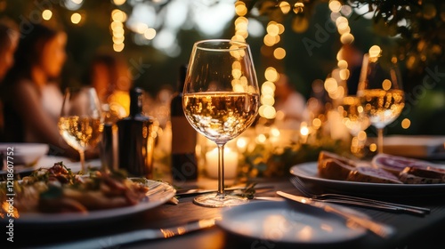 An elegant dining event with guests seated outdoors under fairy lights, sharing gourmet dishes and premium wine.