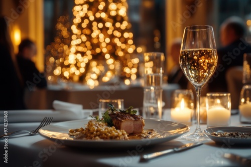 An elegant dining scene features guests enjoying a gourmet meal in a luxurious