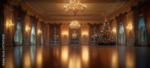 An elegant, empty Christmas ballroom, with sparkling chandeliers
