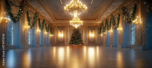 An elegant, empty Christmas ballroom, with sparkling chandeliers