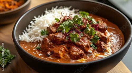 An elegant, gourmet tikka masala bowl with symmetrical arrangement of ingredients, complemented by saffron-infused butter drizzle