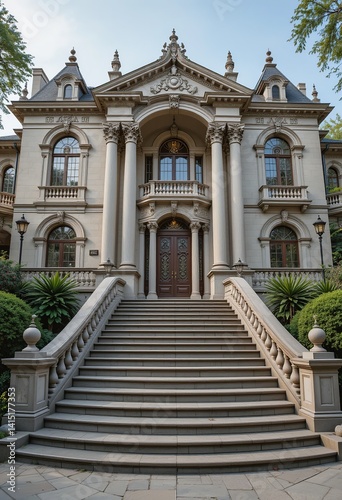 An elegant grand residence with stately columns and a sweeping staircase invites entry to this architectural marvel. Classic design.
