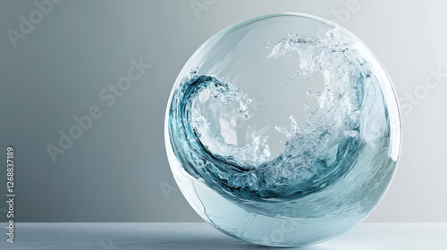 An elegant handcrafted glass orb, infused with fluid aqua and white waves, sitting on a clean