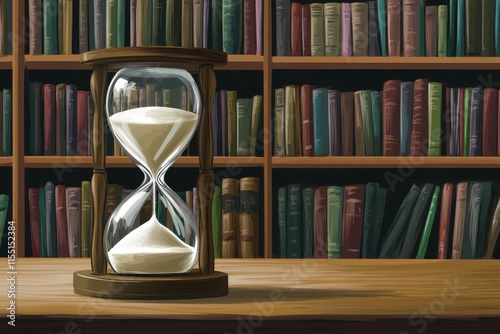 An elegant hourglass sits on a wooden table in front of a backdrop of colorful bookshelves.
