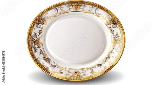 An elegant oval porcelain plate with intricate gold and black decorative patterns along the rim, set against a plain white background.