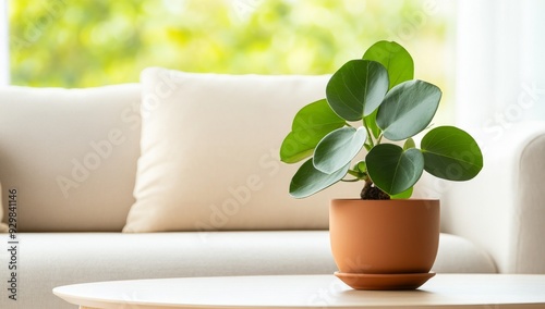 an elegant potted plant with vibrant green leaves, placed on the coffee table