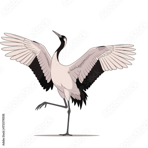 An elegant red crowned crane gracefully dances with its wings spread wide.