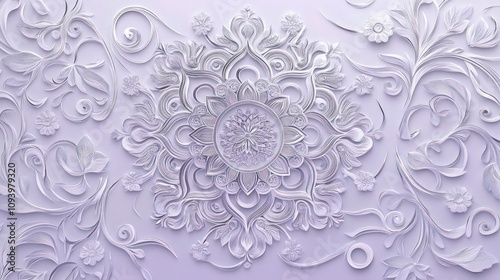 An elegant silver laser-cut design featuring a mandala on a soft lavender backdrop, with detailed swirling patterns and delicate floral accents. The silver shines brightly.