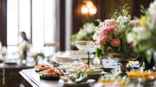 An elegant wedding buffet table, softly lit with a focus on the food arrangement.