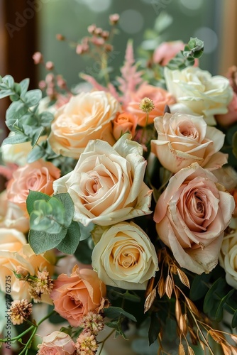 An elegant wedding card template with a sophisticated floral border, featuring roses, leaves, gold lines, and a marble abstract background