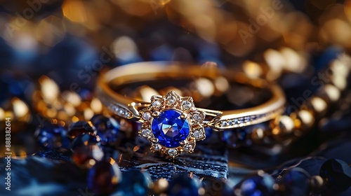 An elegant women's gold ring with blue saphire is placed on a bracelet with precious stones