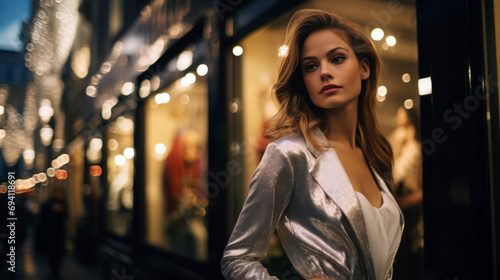 An elegantly dressed woman poses in front of a boutique on the street in the evening