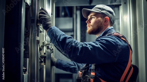 An elevator technician in a work uniform and harness, inspecting and adjusting components inside an elevator shaft, Elevator maintenance scene