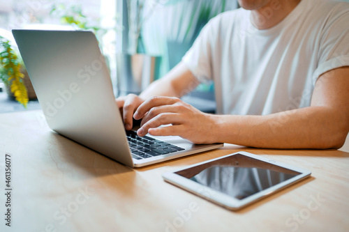 An employee counts finances in an online table. A man works in a cafe on a laptop. Writes an email to clients.