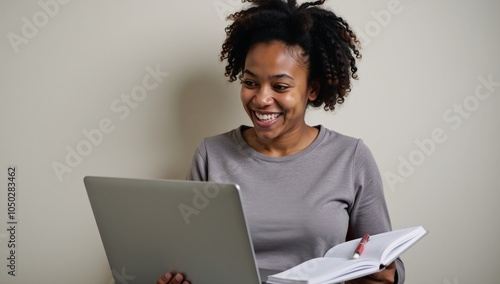 An empowered African-American student engaged in remote learning studying diligently while taking notes
