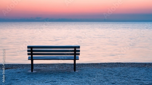 An empty bench on a quiet beach, overlooking the serene sea under a soft, pastel-colored sky at dusk.