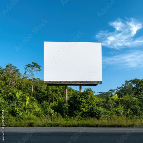 An empty billboard surrounded by lush greenery under a clear blue sky.