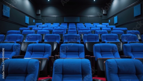 An empty blue movie theater with vacant seats, shrouded in darkness and silence, embodying the essence of cinema, films, and entertainment.
