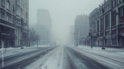 An empty city street covered in frost and haze on the sides of the street are buildings