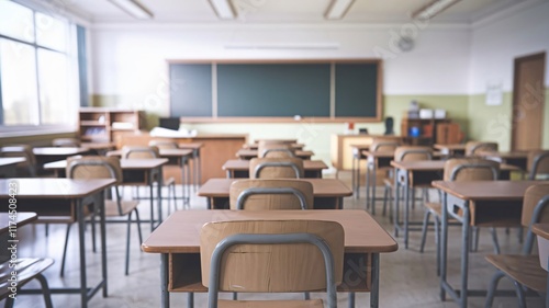 An empty classroom, showcasing neat rows of desks and chairs, a chalkboard, and natural light streaming through the windows.