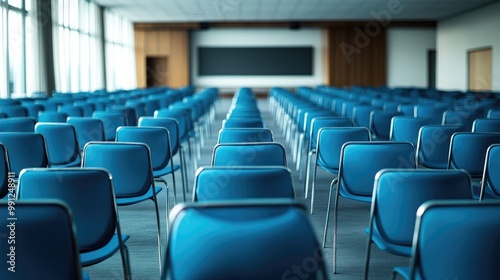 An empty conference room with rows of blue chairs, capturing the calm before a large meeting or presentation
