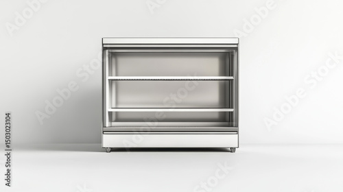 An empty dessert fridge in a coffee shop. Isolated on pure white. Mockup fridge. 3d illustration.