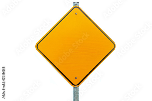 An empty diamond-shaped sign with an orange background stands on a metal post. Concept of caution or warning. For road safety materials.