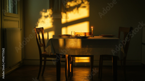An empty dining table set for two in a warmly lit room, with a single candle flickering weakly in the center, casting long shadows over untouched plates and a chair pulled out slightly as if someone