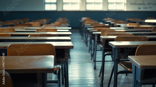 An empty high school classroom with rows of wooden desks and chairs