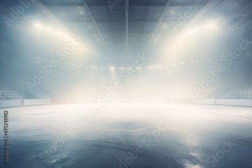 An empty ice rink covered in fog with spotlights shining on the ice. Perfect for winter sports or event concepts