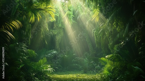 An empty jungle scene with dense tropical plants, sunbeams breaking through the thick canopy, and visible humidity.