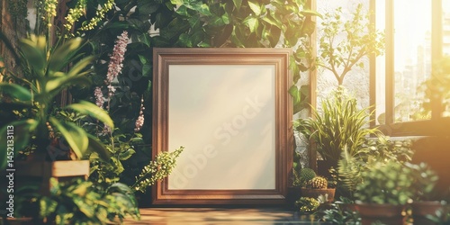 an empty picture frame on a wall surrounded by plants and a large window with sunlight coming in to the room