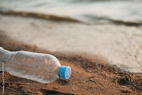 An empty plastic bottle was thrown out on the sand near the shore. Environmental problem of pollution of reservoirs with plastic waste.