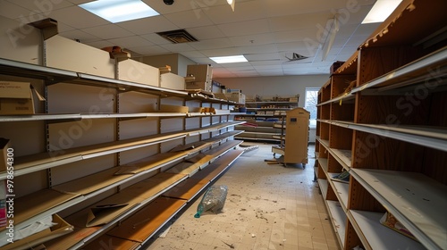 An empty retail store with abandoned shelves and a forlorn atmosphere, captured with a Canon EOS 5D Mark IV and 50mm f/1.4 lens. Natural lighting enhances the desolate mood, emphasizing the emptiness