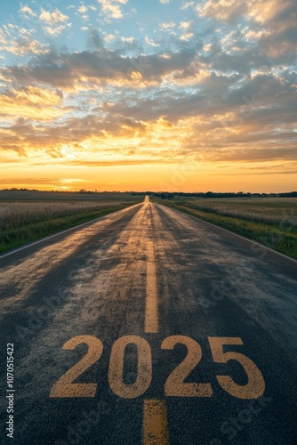 an empty road meeting the sky at the horizon with the text "2025" written on the road, New Year, driving or walking into the new year, Happy New Year