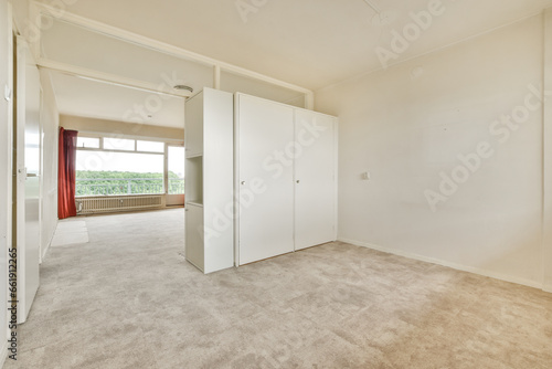an empty room with white walls and carpeted floor, there is a large mirror on the wall to the right